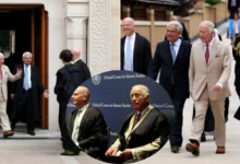In the image, King Charles is seen dressed in a grey suit, a dotted maroon tie, and polished black shoes, smiling warmly as he greeted the visiting president, who wore a formal black suit. The two exchanged handshakes and pleasantries during the official welcome.