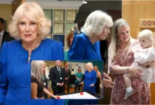 In the photos, Queen Camilla appeared joyful and gracious, donning a royal blue, long-sleeved dress paired with a woven clutch and coordinating bracelet, as she moved through the hospice’s welcoming spaces.